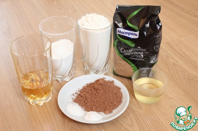 Для шоколадного теста беру: 110 г муки, 30 гр. какао, 50 г сахара, 70 мл яблочного сока, 45 г крахмала, 50 мл растительного масла, по щепотке соли и соды.