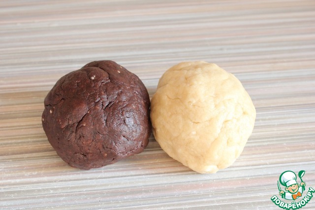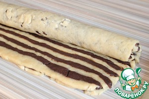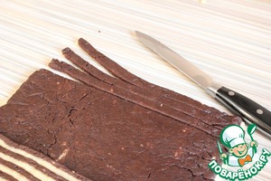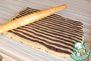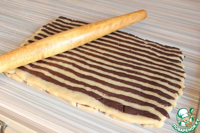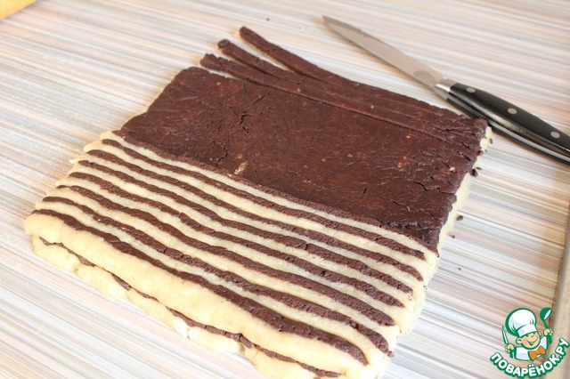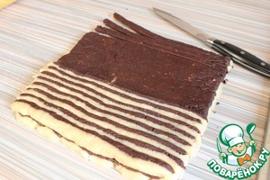 Раскатываем 2 пласта: шоколадный и ванильный. Шоколадный выкладываем сверху ванильного ( с помощью скалки, накрутив). Получается один прямоугольник (снизу белый, сверху шоколадный). Одна сторона прямоугольника длинная, другая покороче. С той стороны, которая короче начинаем отрезать полоски. И, развернув их плашмя, укладываем их на противоположный короткий край прямоугольника (сверху на шоколадный слой). Так отрезаем и укладываем, пока не "встретимся" в середине. В итоге должно получится полотно из трёх слоев: нижний ванильный, средний шоколадный, верхний полосатый. Затем все эти три слоя сворачивает в рулет.