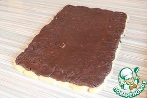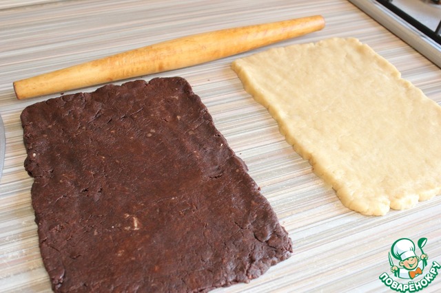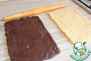 Выкладываю шоколадный пласт теста на ванильный. Слегка прокатываю их скалкой, так чтобы толщина общего пласта была 1 см.