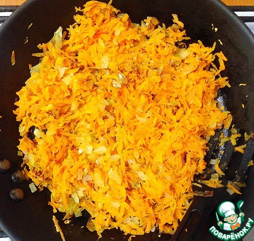 Морковь почистить, натереть на крупной тёрке, добавить к луку и обжаривать на маленьком огне до золотистости.