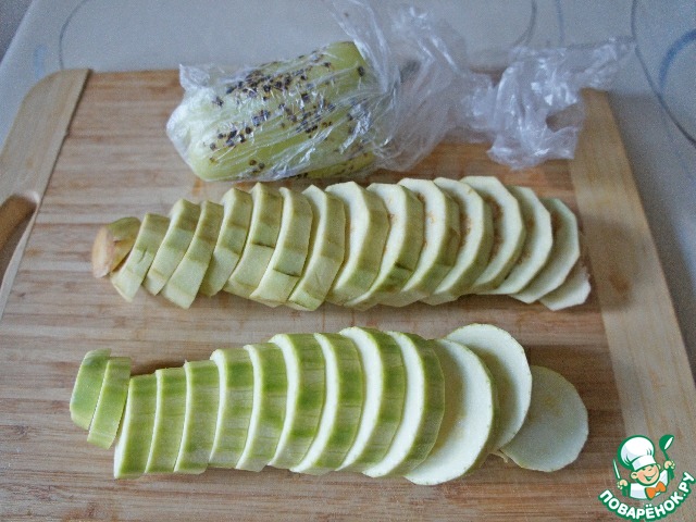 Баклажан и кабачок очистить от кожицы и нарезать кружочками. Если кабачок молоденький, можно его не чистить.