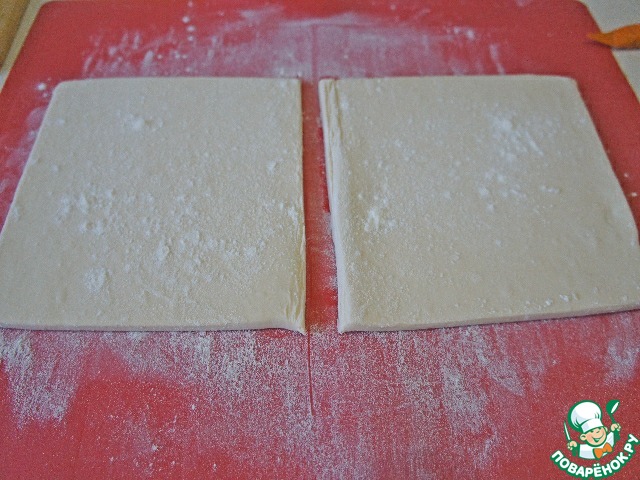 Тесто полностью разморозить и слегка раскатать в квадраты.