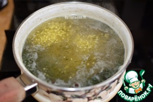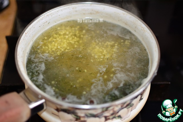 В бульон вложить пшено, перцы, лавр и варить под закрытой крышкой до готовности пшена. -