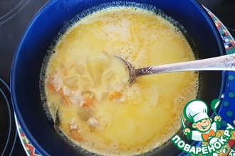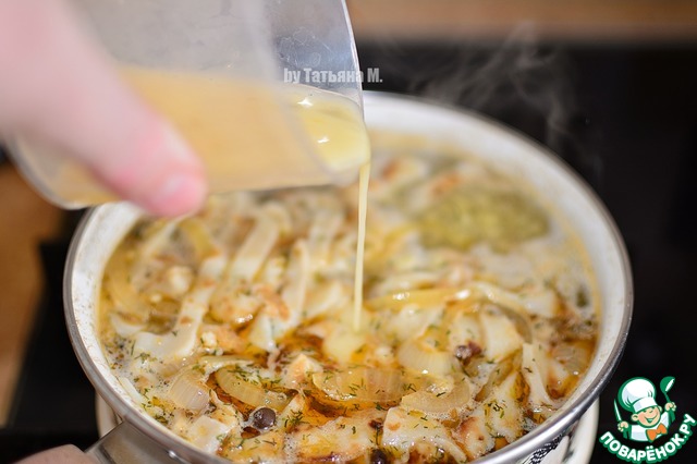 Яйцо размешать в стакане, как только суп закипит, тонкой струйкой вылить яйцо. При повторном закипании, суп выключить и накрыть крышкой.