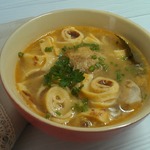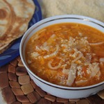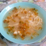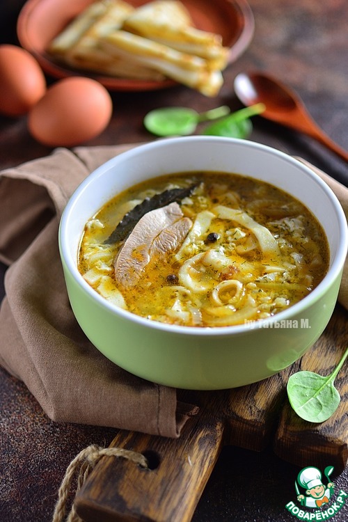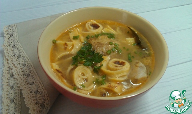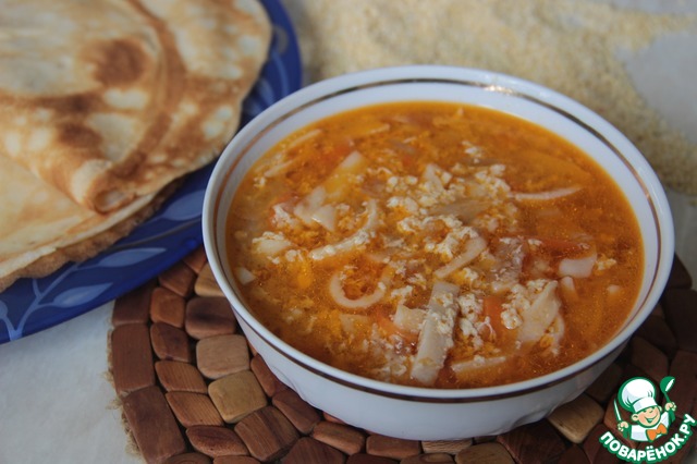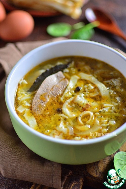Мясной суп с блинами и яйцом