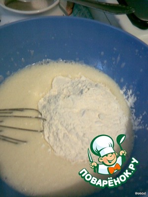 Всыпать муку, разрыхлитель, сметану, растительное масло и всё хорошо перемешать ложкой (желательно деревянной).