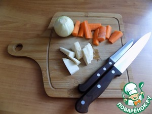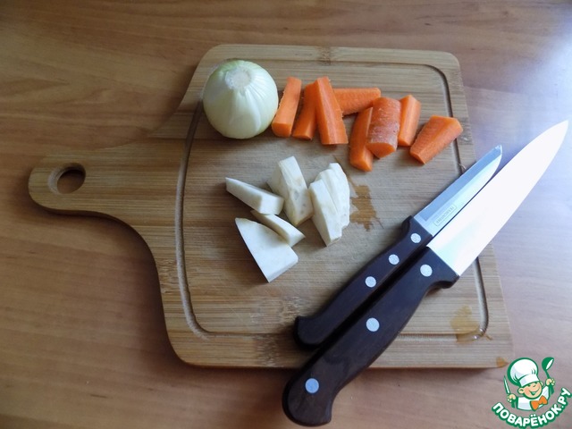 Для супа нам нужно сварить овощной бульон. С ним вкуснее. Это точно, т к я суп варить пробовала и просто на воде. Ставим кастрюлю с водой на огонь, доводим до кипения и выкладываем овощи: лук репчатый целиком, корень сельдерея и морковь, порезанные крупными ломтиками. Варим до готовности, а это минут 20. Не солим. Шумовкой удаляем овощи и лук с корнем сельдерея выбрасываем, морковь оставляем. Она нам пригодится. Конечно можно оставить и сельдерей, но у меня его не любят и я не говорю, что он в супе присутствовал. Когда из бульона всё уберёте, выкладывайте рис.