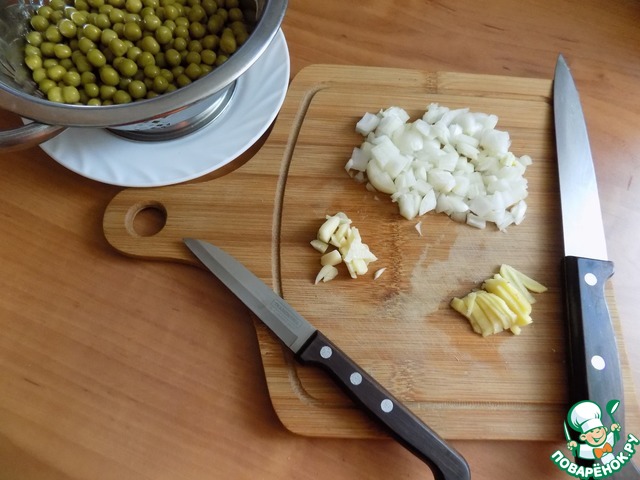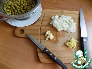 Пока рис варится, а варится он у нас до готовности. Делаем заправку к супу. Горошек зелёный откидываем на дуршлаг, чтобы стекла жидкость. Лук и чеснок мелко режем. Имбирь режем тонкими небольшими пластинками.