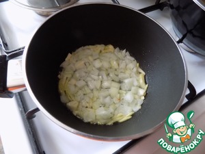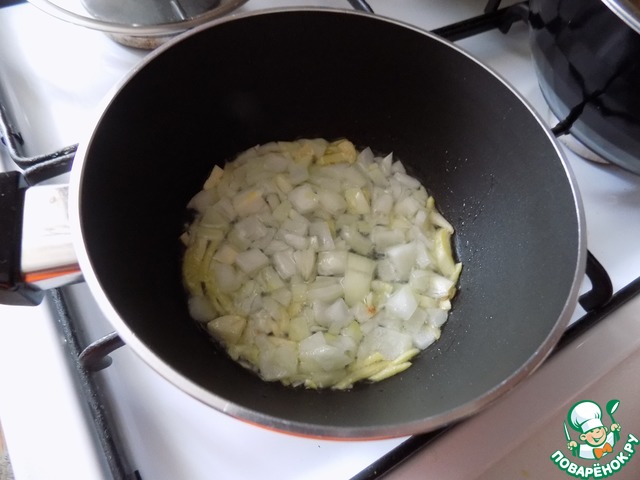 В сотейник наливаем 1 ст л оливкового масла. Нагреваем его и выкладываем чеснок, через секунд 30 - имбирь, обжариваем чуть, чтобы чеснок и имбирь отдали свой аромат маслу и выкладываем лук. Золотим его.