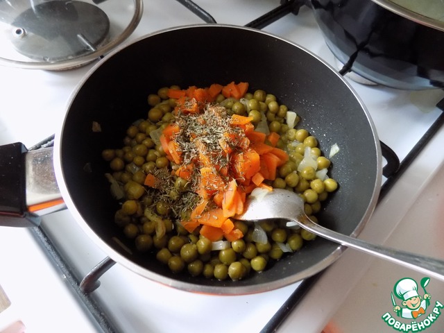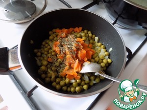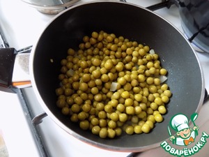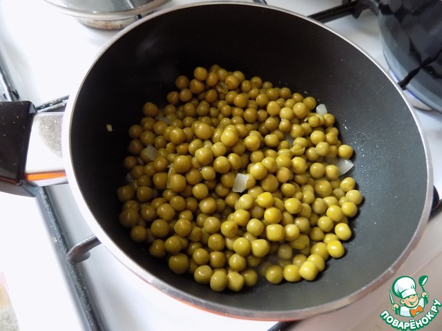 Когда лук у нас будет готов, выкладываем зелёный горошек, перемешиваем, убавляем огонь и томим под крышкой пару минут.