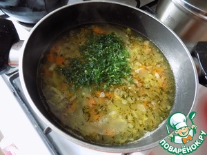 Рубим мелко петрушку и отправляем в суп. Наливаем в суп ещё одну ложку масла оливкового. Ещё 1 минута и снимаем суп с огня. Даём постоять немного под крышкой.