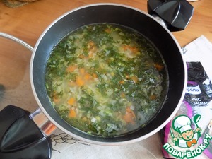Рис сварился, выкладываем заправку, солим по вкусу, варим суп минут 5 под крышкой на маленьком огне.