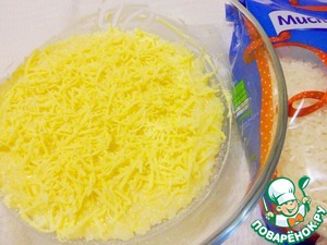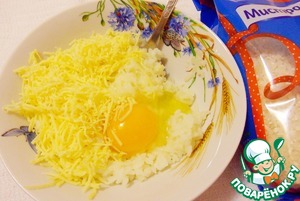 Переложить рис в миску, вмешать в теплый рис сырое куриное яйцо, половину натертого сыра, половину сливочного масла и щепотку соли.