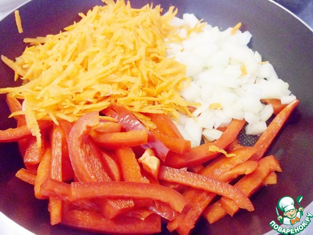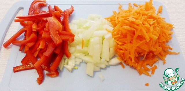 Лук, морковь очистить. Лук мелко нарезать, морковь натереть на крупной терке. Сладкий болгарский перец очистить от семян и нарезать соломкой.
