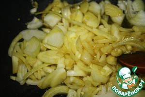 Разогреть 3 ст. л. растит. масла, добавить куркуму и черный перец и затем добавляем лук. Обжариваем около 5 минут. -