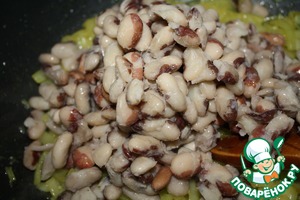 Добавляем фасоль к луку и обжариваем вместе, присаливаем по вкусу. -