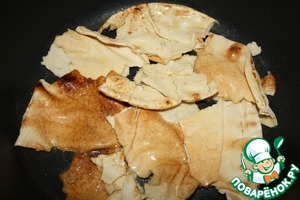 Разломать лаваш и выложить его на дно.
