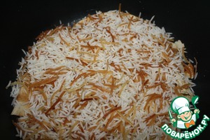 Закипятить воду, добавить 2 стол. ложки соли и рис с вермишелью. Варить около 5 минут если у вас басмати, или чуть дольше до состояния аль денте.