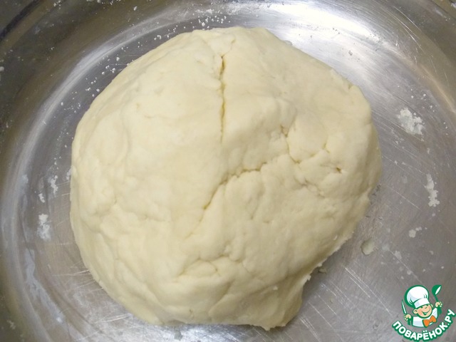 Перетереть охлажденное масло с крахмалом и мукой, которая была смешана с сахаром и разрыхлителем в крошку. Добавить сметану и замесить мягкое тесто. Если надо то добавьте немного сметаны или муки.
