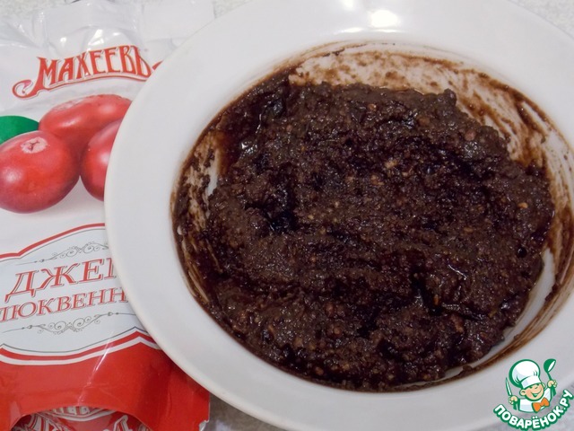 Печенье поломать и превратить в мелкую крошку, смешать с какао и джемом до однородной массы. Я брала клюквенный, но подойдет и вишневый. Масса должна быть похожа по консистенции на шоколадную пасту. Если очень густая, добавьте еще джем.