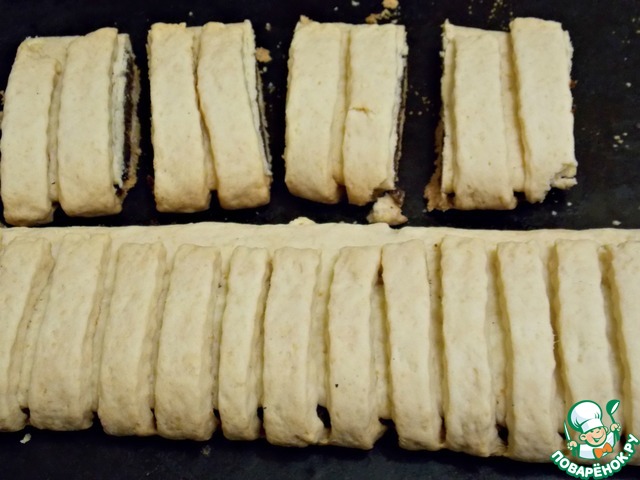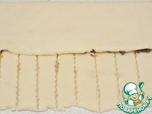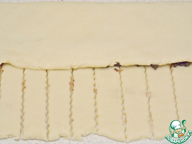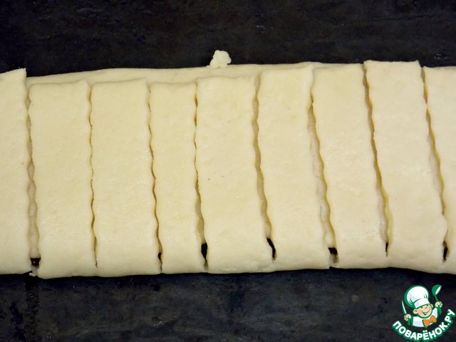 Затем накрыть ими полоски. Положить на противень перевернув полосками вверх. Тоже самое проделать и со вторым куском теста.