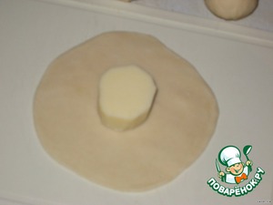 Из шариков раскатать лепешку, толщиной как на пельмень, выложить на серединку сыр,