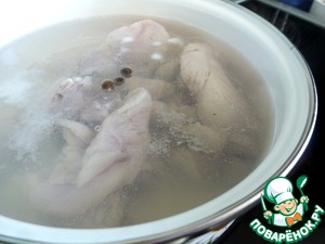 В воду положить куриную грудку и желудки, варить 30-40 минут. Воду подсолить, положить душистый перец. Пенку снимать!