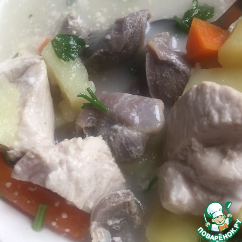 Помните, Глеб Жеглов в исполнении В. Высоцкого в фильме "Место встречи изменить нельзя", в перерыве от сыскной службы мечтал "о супчике, да с потрошками!" Знал, чертяка, о чём говорил! Супчик действительно получается очень вкусным, нежным и ароматным. А если зеленью посыпать, да половинку вареного яйца положить, да сметанкой забелить, язык проглотить можно. Угощайтесь!