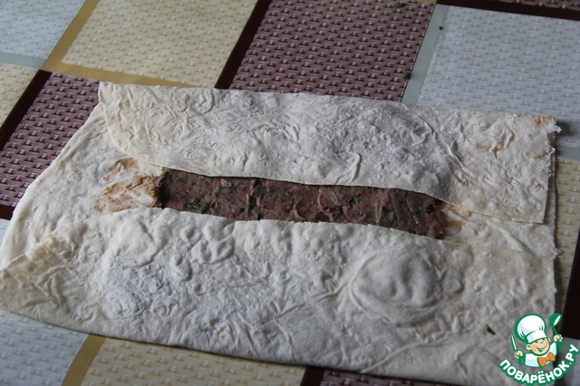 Лаваш разрезать пополам (у нас они продаются овальными). Намазать половиной паштета. Свернуть конвертом.
