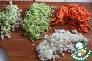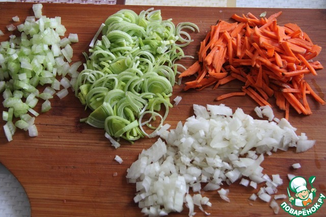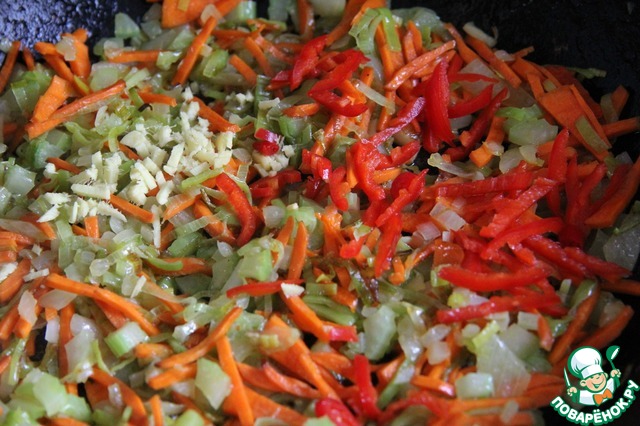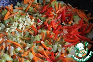 Припустить на оливковом масле два вида лука, морковь и сельдерей.