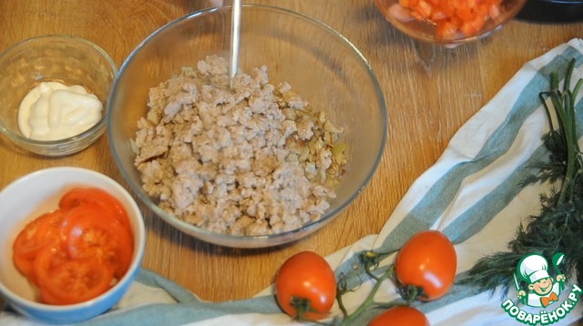 Грибы нарезаем небольшими кусочками, лук мелкими кубиками. Обжариваем на растительном масле 5-7 минут. Отдельно обжариваем фарш. В глубокой миске смешиваем грибы с луком и фарш. Мелко нарезаем 1 помидор, выкладываем к остальным ингредиентам. Добавляем соль, перец, сушеный чеснок и мелко нарезанный укроп, хорошенько перемешиваем