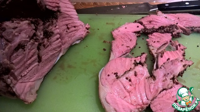 Для духовки - разогреваем ее до минимальной температуры, но не меньше 58° C. Заворачиваем ногу в фольгу, кладем на противень и ставим в духовку. Периодически проверяем температуру внутри мяса. После того, как она дойдет до 58° C (несколько часов), готовим еще минут 30 - 40.