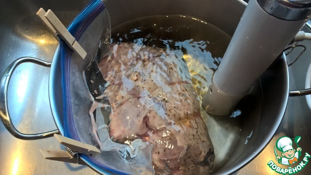 Разогреваем Су Вид до 58° C, погружаем пакет с ногой в воду, удерживая горловину над водой и даем воде выдавить воздух. Запечатываем пакет, закрепляем прищепками на стенке кастрюли с Су Вид термостатом - так, чтобы горловина пакета была над водой. Следим, чтобы было достаточно воды (1 - 2 см) над верхней частью мяса. Закрываем кастрюлю сверху пищевой пленкой - чтобы вода не испарялась и готовим в течении 6 часов.