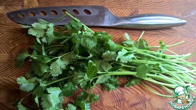 Мелко нарубаем кинзу со стеблями и добавляем в соус