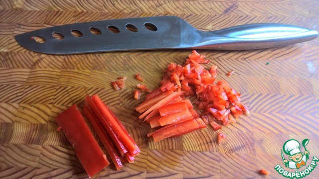 Красный сладкий перец нарезаем кубиком 2 мм и добавляем в соус