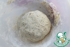 Добавить постепенно стакан воды. Замесить в течение ок. 5 минут тесто. Накрыть пленкой/полотенцем и оставить стоять в течение 15-20 минут.