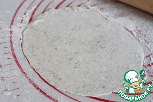 Разделить тесто на 25 частей, скатать в шарики. Шарик раскатать очень тонко (примерно с толщину бумаги) на припыленной мукой поверхности (форма значения не имеет). В это время оставшиеся шарики находятся под пленкой/полотенцем.