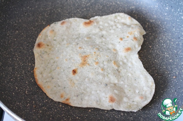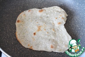 На среднем огне разогреть сковороду. Жарить лепешку с обеих сторон без добавления масла до золотистого цвета. Это занимает ок. 2-3 минут.