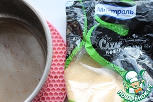 Сделать сахарный сироп. Смешать воду и сахар. Поставить на огонь и добиться растворения сахара. Важно не передержать! Нам не нужна карамель. Довести температуру до ок. 40 градусов (на фото у меня в сироп случайно просыпалась корица, прошу извинить за оплошность)