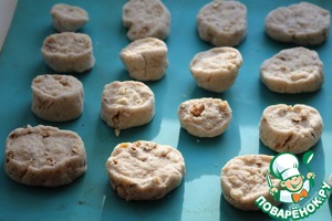 Добавить сахарный сироп в сухие ингредиенты, тщательно перемешать и замесить тесто на припыленной мукой и сахарной пудрой поверхности. Оно получается крутым. Разделить тесто на 3 части, каждую часть скатать в "колбаску". Разделить колбаску на заготовки толщиной ок. 4-5 см. Выложить заготовки на застеленный пергаментом или силиконовым ковриком противень.
