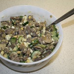 Увидела в одной из телевизионных программ, попробовала и очень понравилось. Печеночка с белыми грибочками, огурчиками, яйцами - супер!
