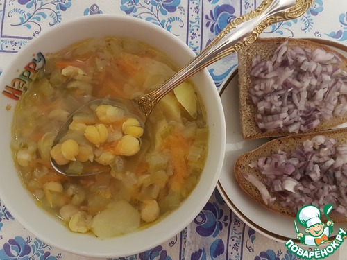 Нут — разновидность гороха. Приготовьте суп из нута хотя бы раз, и вы сразу поймете, насколько это вкусно. И полезно. Бобовая культура богата растительными белками — они усваиваются организмом лучше, чем животного происхождения. Много сложных углеводов, клетчатки, которые хорошо насыщают и надолго купируют чувство голода. Восточные целители рекомендовали вареный нут для нормализации пищеварения. К этому супу предлагаю приготовить бутерброды с луком.