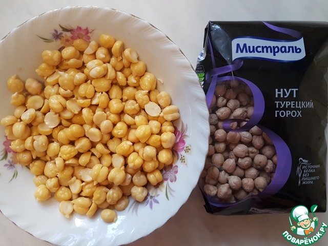 Я использовала нут (турецкий горох) ТМ "Мистраль. Замочить в воде не менее чем на 4 часа. У меня был замочен на 6 часов. Сегодня я не поленилась и почистила его от шкурки, тем более после замачивания это быстро делается, горошина сама выскакивает из оболочки, если на нее нажать. Но это делать совсем не обязательно. Варим в бульоне 1 час.