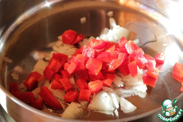 Лук мелко нарезать, перец нарезать на небольшие кубики.
