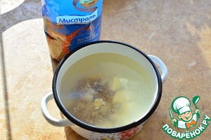 Добавить гречку душистый горошек, гвоздику, варить до полуготовности крупы. -
