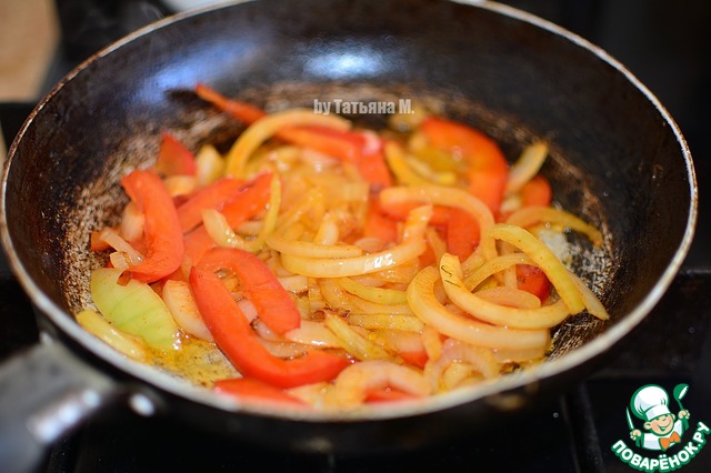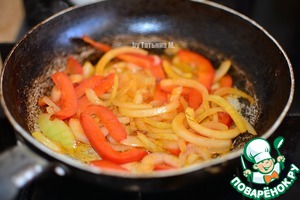 Лук и перец порезать и пожарить на масле с добавлением паприки.