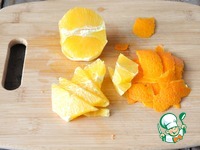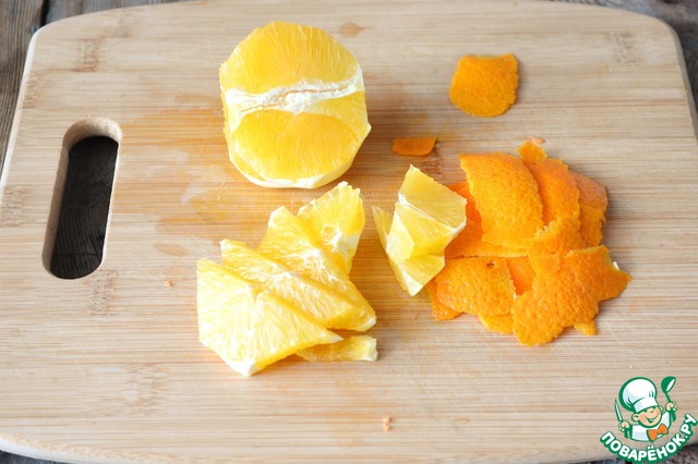 С апельсина снимите цедру и измельчите её ножом (или снимите специальной тёркой), а мякоть нарежьте на кусочки. |