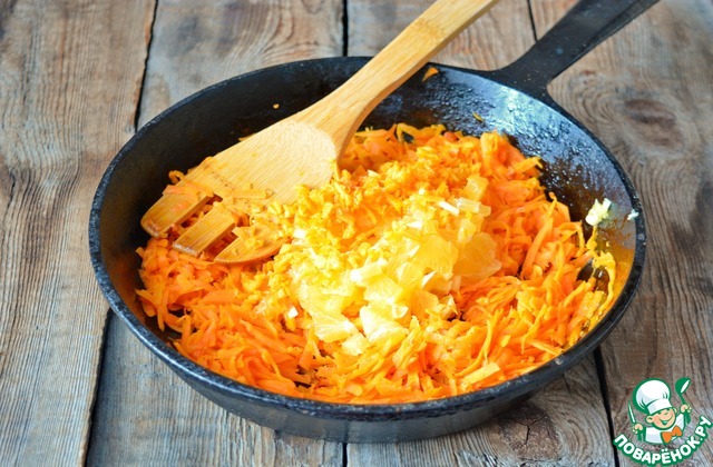 Разогрейте в сковороде масло, тушите морковь в масле под крышкой около 15 минут, добавьте измельченную цедру и нарезанный апельсин |