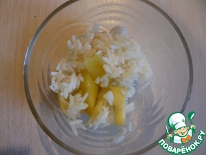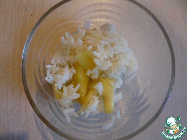 Манго очистить, мякоть отделить от косточки. Порезать дольками. Перемешать с отварным рисом.