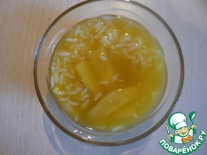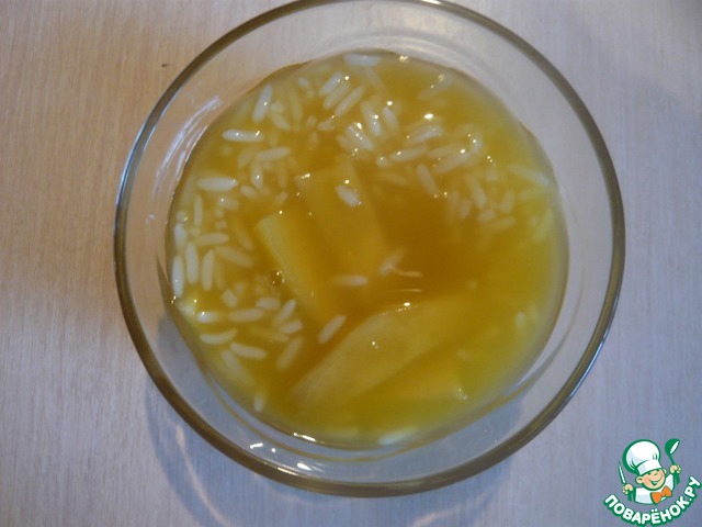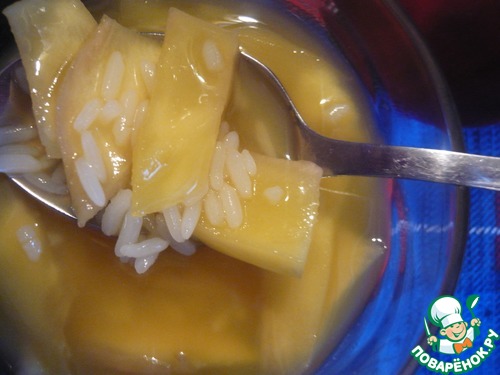 Выкладываем рис с манго в порционные тарелки. заливаем фруктовым супом.